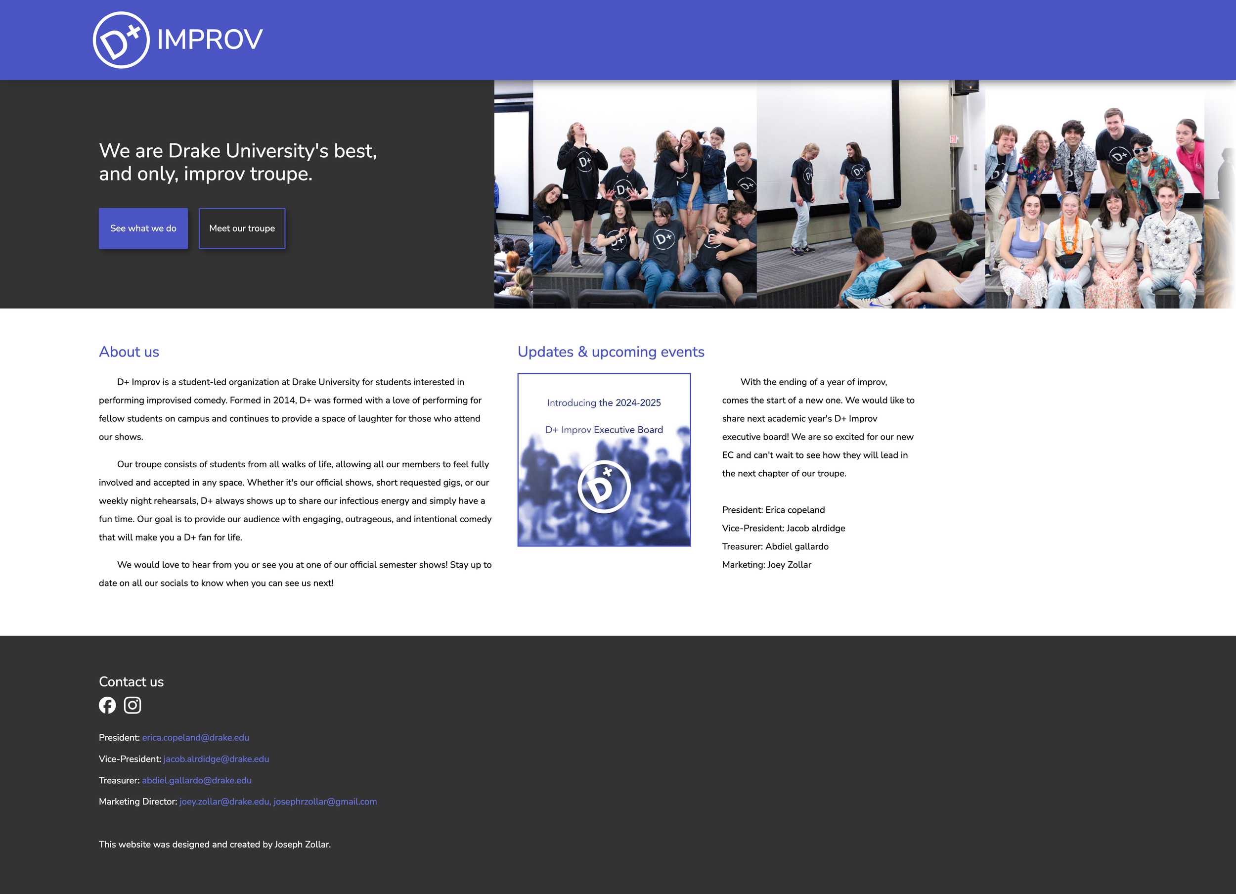 I pursued this project as the marketing director for Drake University’s best and only improv troupe, D+ Improv. To challenge myself, I designed and developed a static website from scratch.